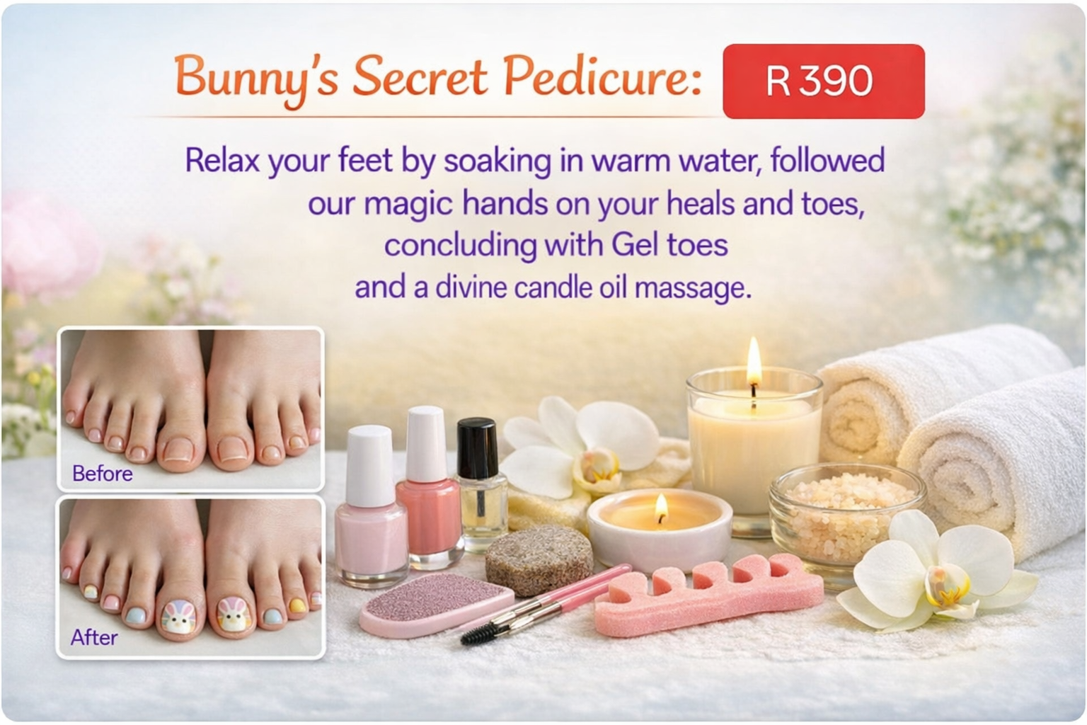 Treat your feet to a luxurious Easter-inspired experience with our Bunny’s Secret Pedicure. For just R390, enjoy a relaxing soak in warm water, followed by a rejuvenating heel and toe massage. Finish off with your choice of Gel Toes and a soothing candle oil massage that leaves your feet soft, pampered, and picture-perfect.